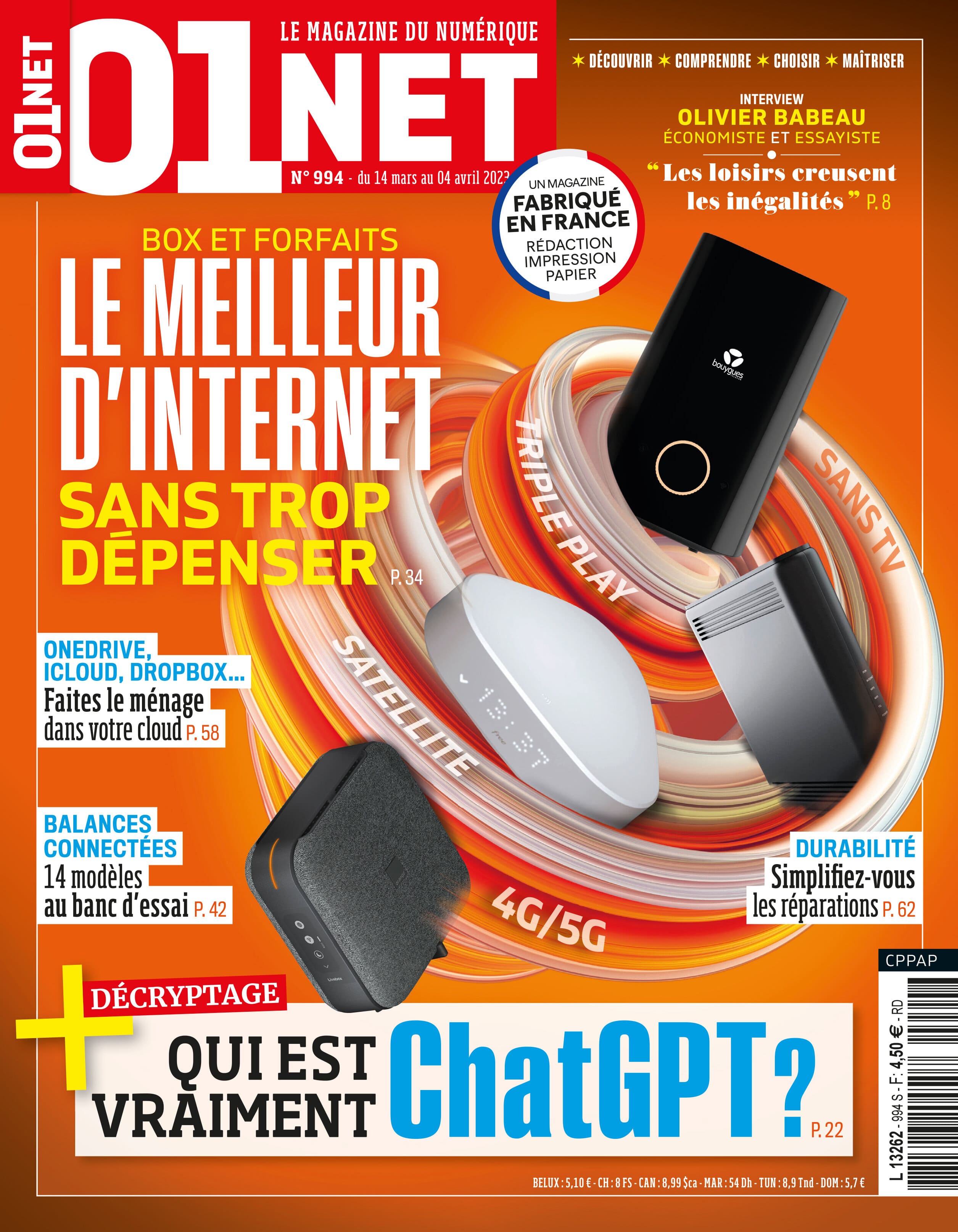 Leader sur son marché, 01NET magazine décrypte les innovations technologiques, l’actualité des produits high-tech et l’impact de la transformation numérique dans la société. Diƻusé en versions papier et digitale, 01NET magazine accompagne une très large communauté (*) au travers d’une parution quinzomadaire, mais aussi d’une collection de hors-série et des réseaux sociaux.